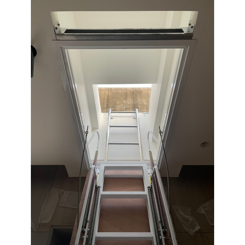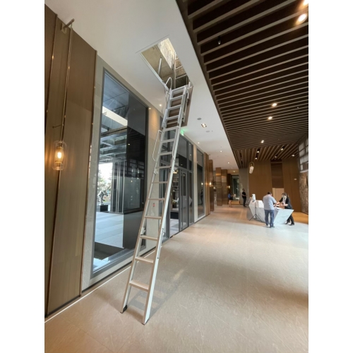 隱藏式伸縮折疊拉梯,適用於通往閣樓、水塔、夾層的伸縮折疊拉梯,解決空間不足的最佳方案! 拉梯詢價請提供: 安裝縣市、天花板下高度、洞口大小 適用高度: 210~380cm 適用洞口尺寸: 寬70cm*長90~130cm (依樓高而訂)